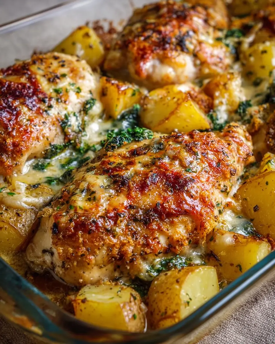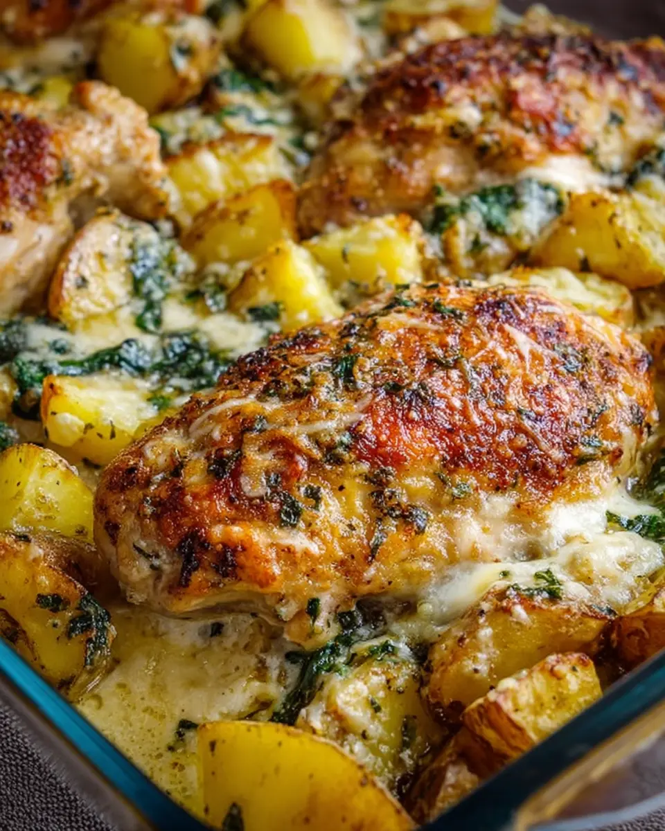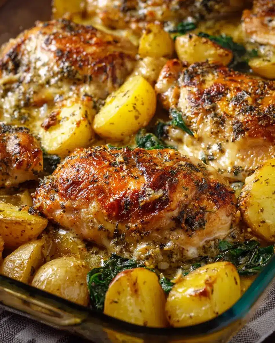 Now it’s time for the chicken! Season 6 bone-in chicken thighs with kosher salt, pepper, and 1 tablespoon of Italian seasoning. Place the seasoned chicken skin-side up in your greased baking dish, followed by the sautéed spinach and 1 pound of halved baby Dutch potatoes. Pour that luscious cream sauce over everything. The sauce not only adds flavor but works its magic on the chicken and potatoes as they cook together!