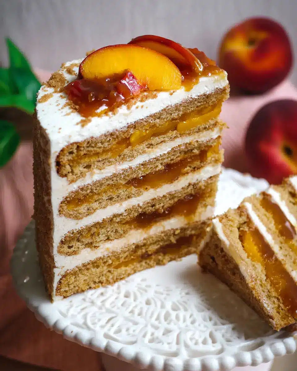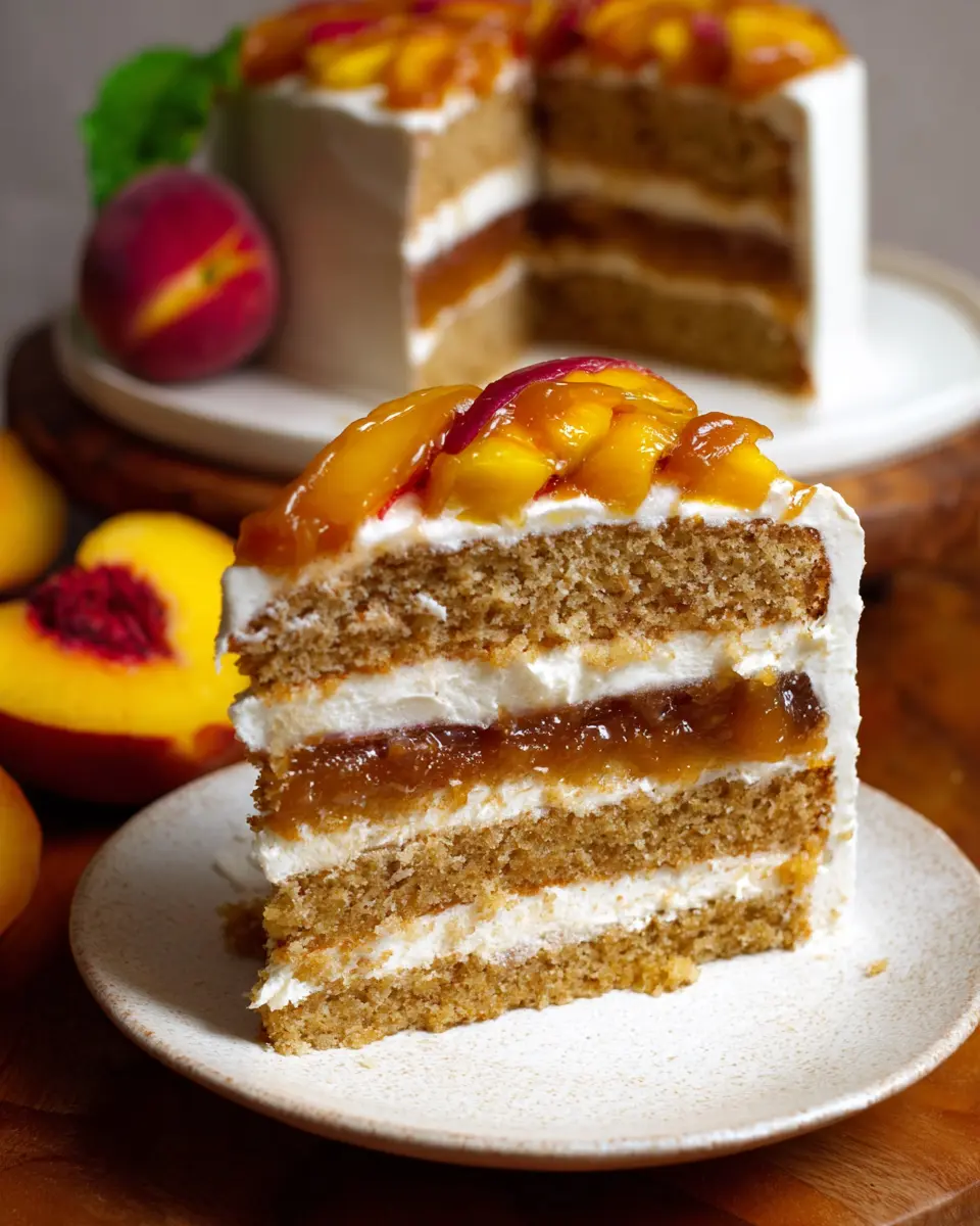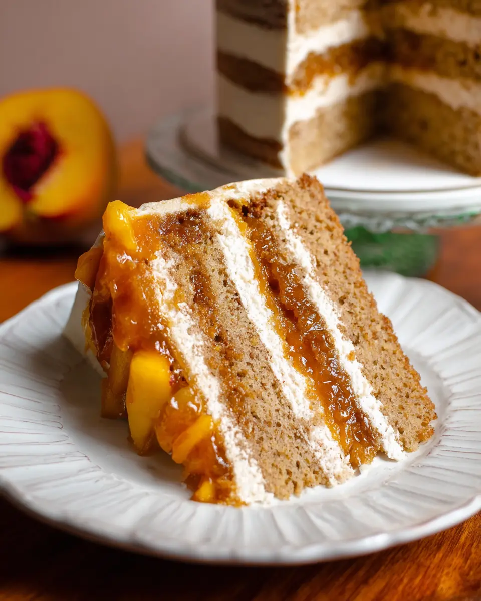 Imagine hosting a backyard barbecue or a sunny picnic. What's better than slicing into a beautiful layer cake, with soft cinnamon-spiced cake layers and a luscious peach filling oozing from between? This cake is not only a feast for the eyes but also a delicious way to celebrate the freshness of seasonal fruit.