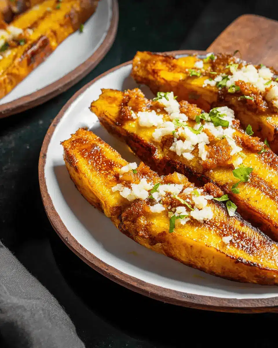 Once the plantains are done, create a slice in the center of each half, making sure to keep it about an inch from the ends. This is where the stuffing magic happens! Spoon in generous amounts of your savory beef mixture until it’s filled to the brim. For that extra touch, sprinkle some crumbled queso fresco on top.