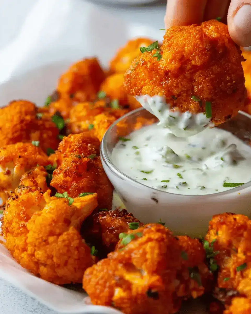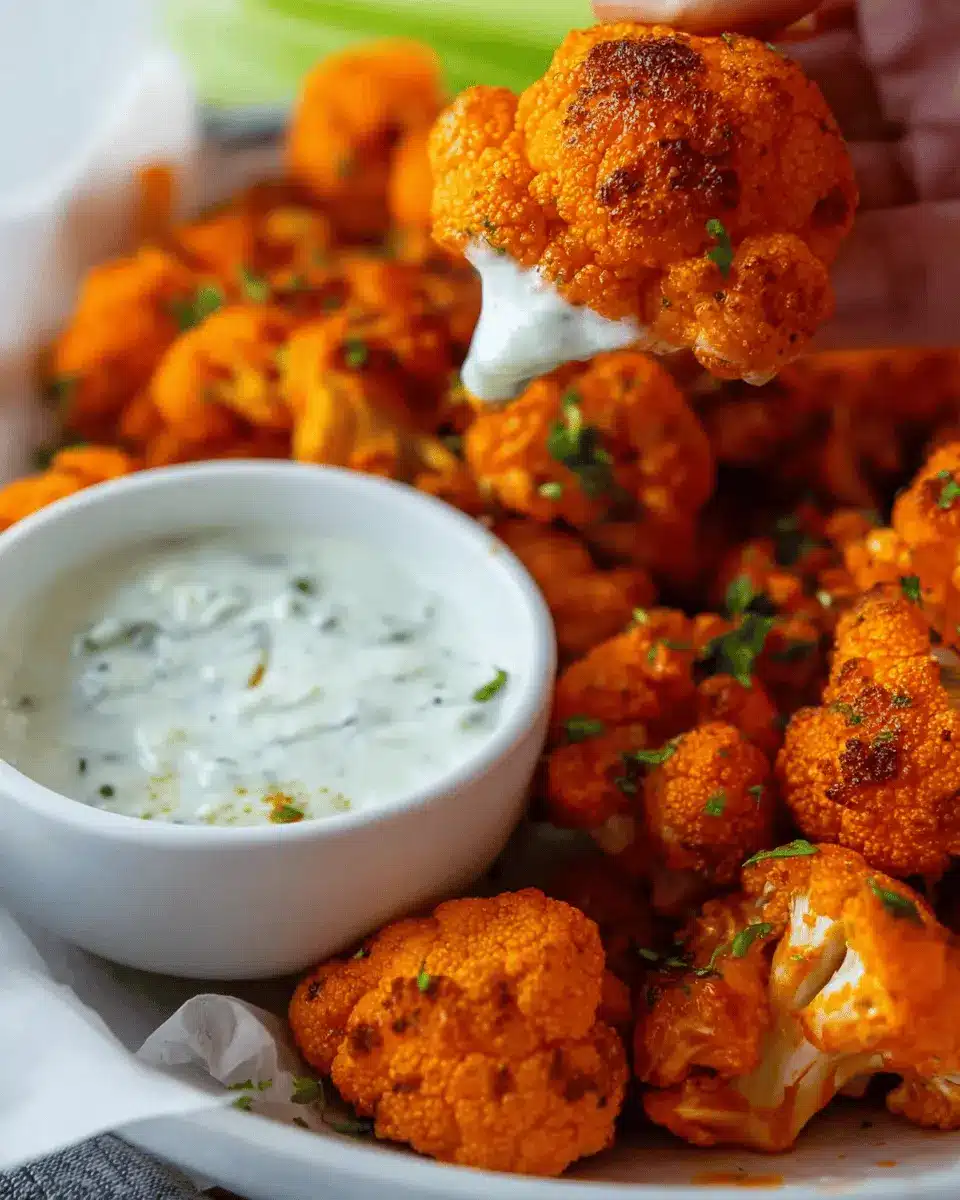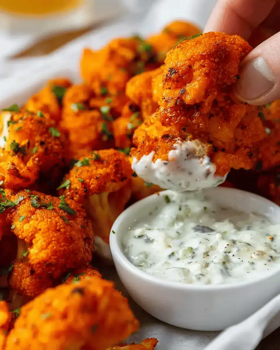 Are you ready to impress your friends with this mouthwatering dish? Dive into the crispy goodness of Cauliflower Buffalo Wings with Vegan Ranch Dip!