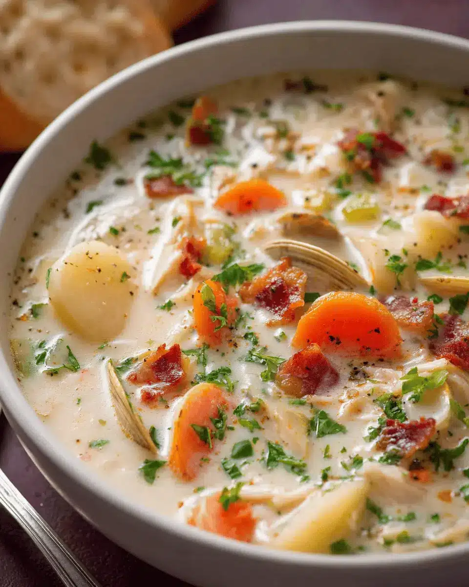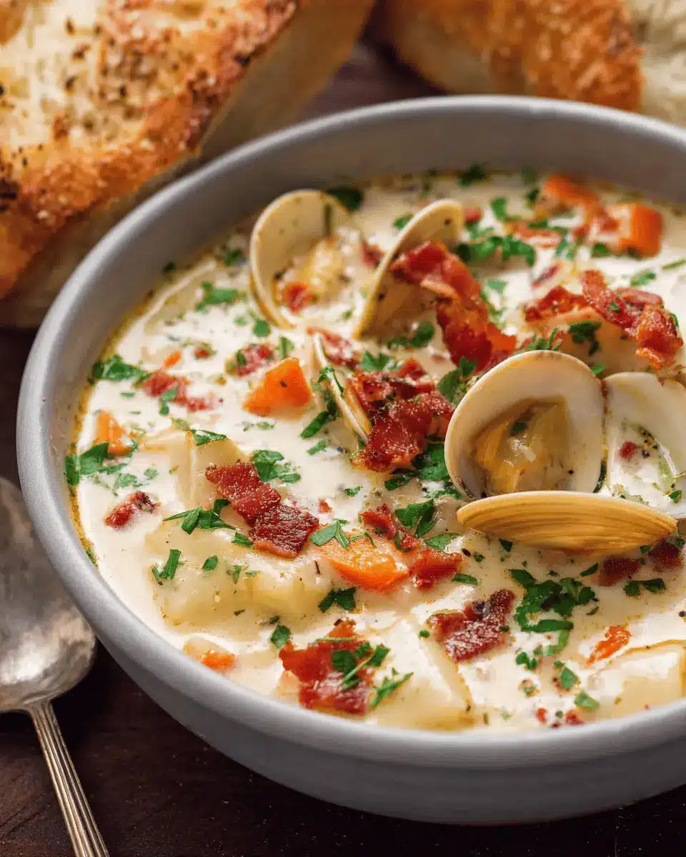 To elevate your clam chowder recipe, consider pairing it with warm, crusty bread or sourdough rolls that can soak up the creamy broth. A simple side salad with fresh greens adds a nice crunch. As for toppings, sprinkle some crispy turkey bacon on top for a smoky flavor, or try enhancing it with fresh herbs like chives or parsley. A drizzle of olive oil or a sprinkle of paprika can add an appealing finish.