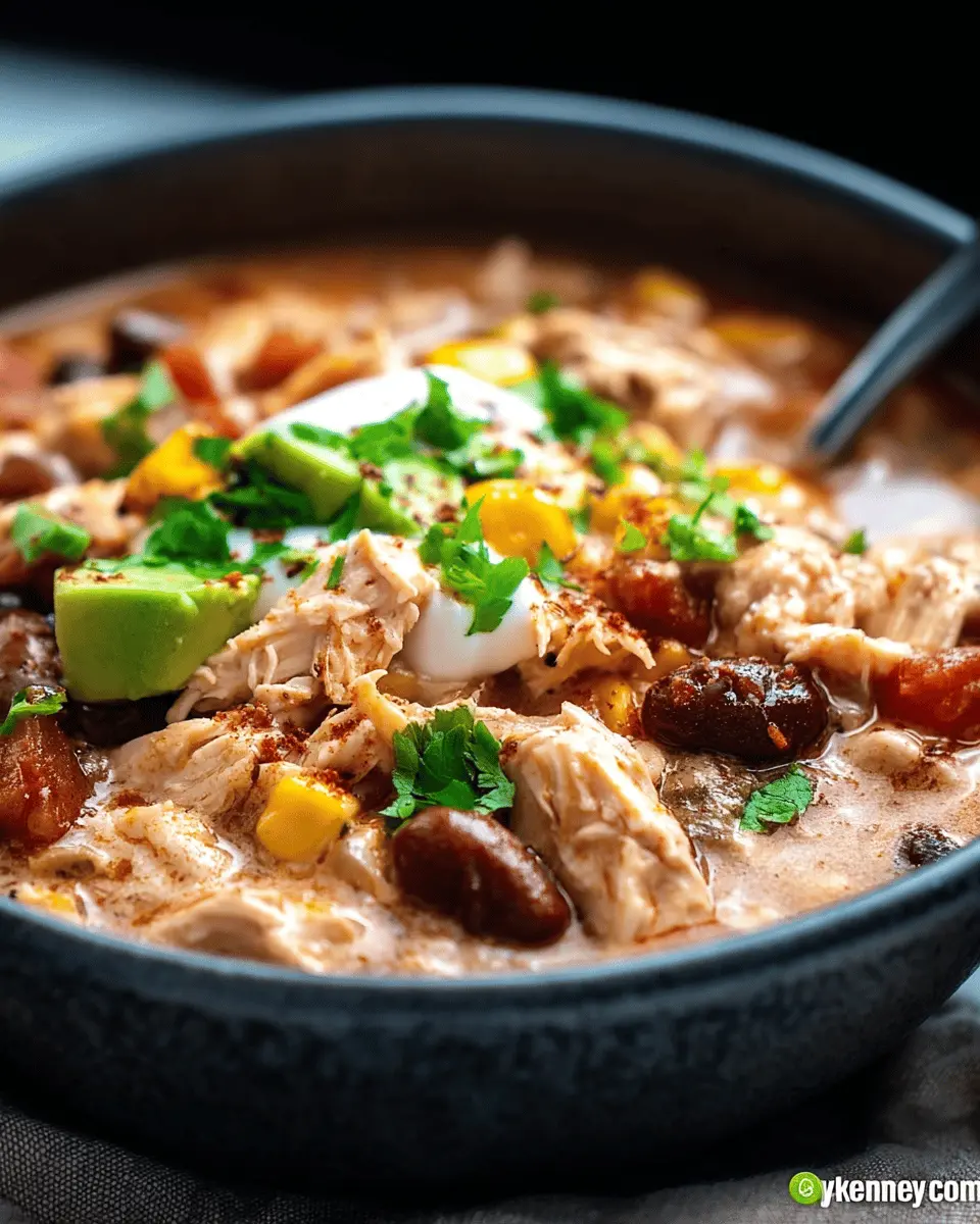 This cream cheese chicken chili is sure to be a hit with its rich flavors and creamy texture. Top with fresh cilantro and avocado for that perfect finishing touch. Enjoy your cozy meal!