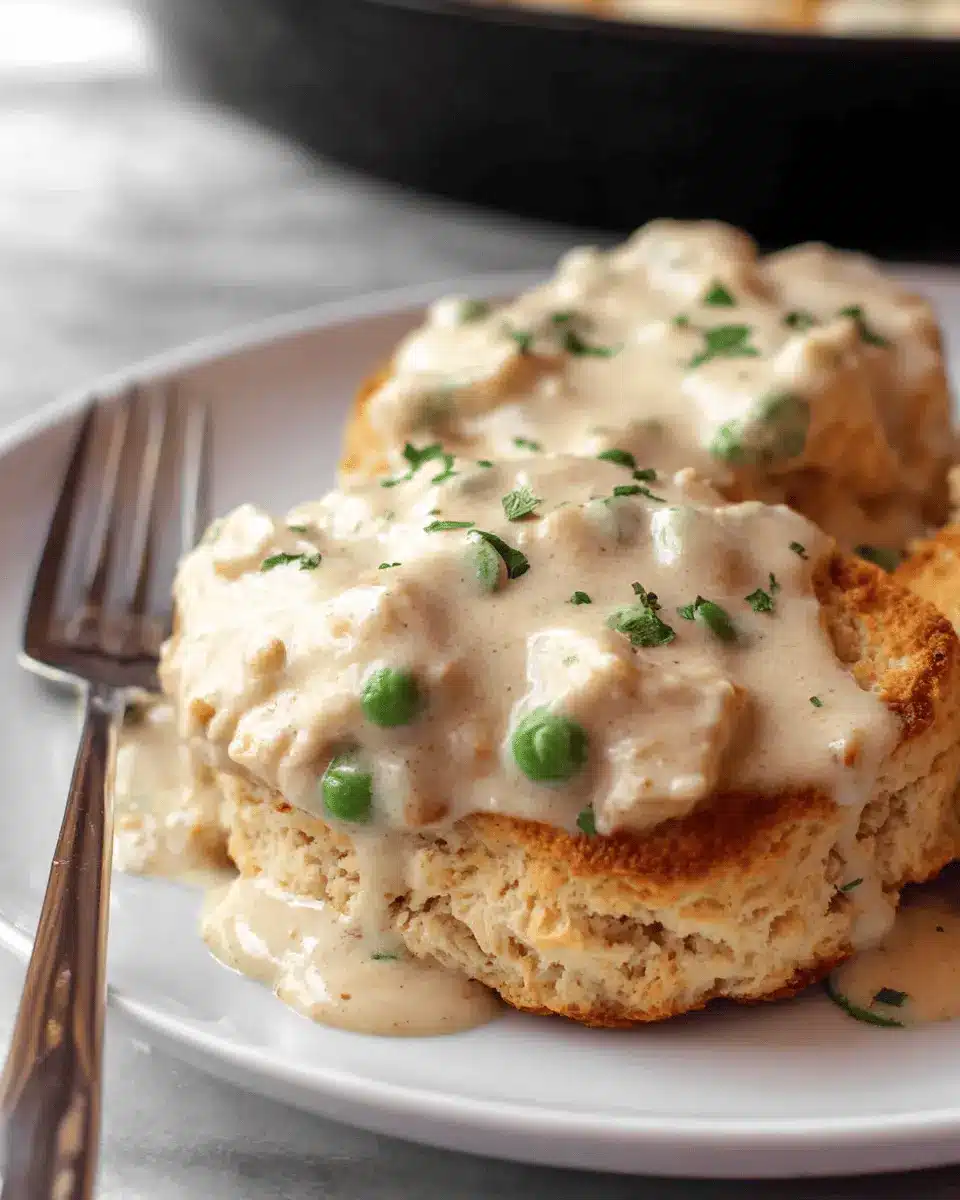 Finally, it’s time to plate your masterpiece! Slice open those fluffy biscuits and ladle the luscious creamed chicken mixture right on top. This dish is perfect for family gatherings or even a cozy weeknight dinner, and it’s sure to impress anyone who gets a taste.