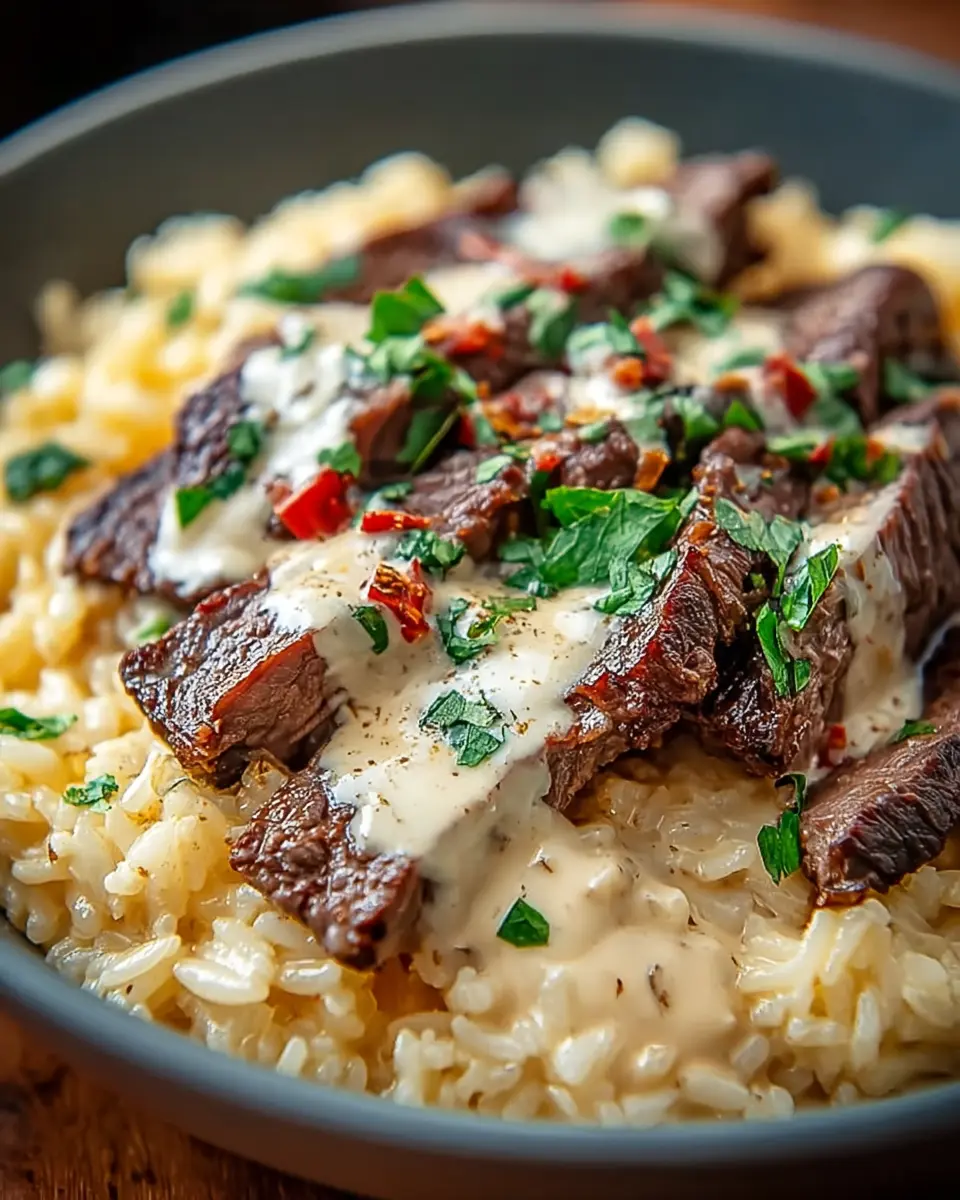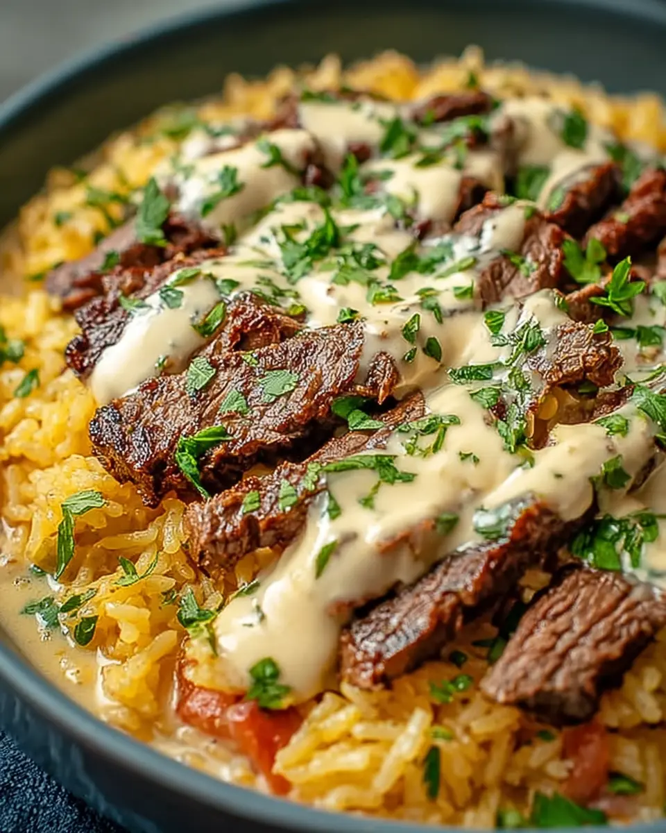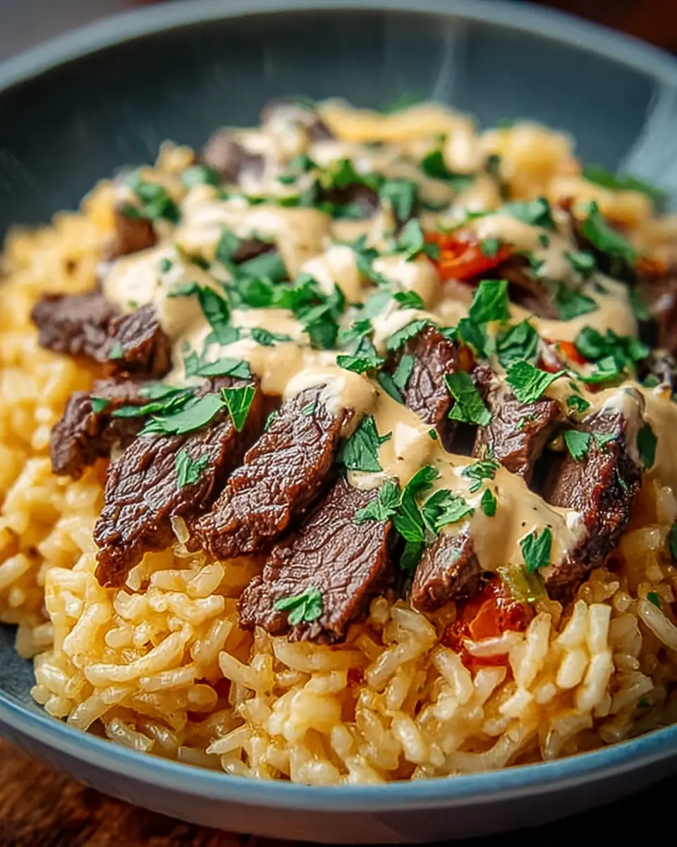 Creamy Queso Rice with Steak Strips: A Delicious One-Pan Recipe