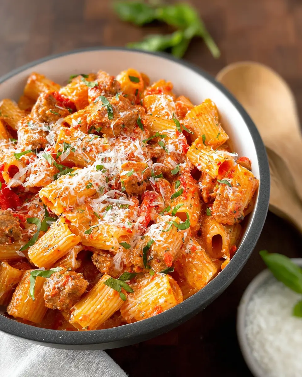 To serve, ladle the creamy tomato sausage rigatoni into bowls, and don’t forget to sprinkle some freshly chopped basil on top for that pop of flavor and color. If you’re feeling indulgent, add a bit more Parmesan too! Enjoy your delicious homemade meal with a side salad or crusty bread for the perfect dining experience. Happy cooking!