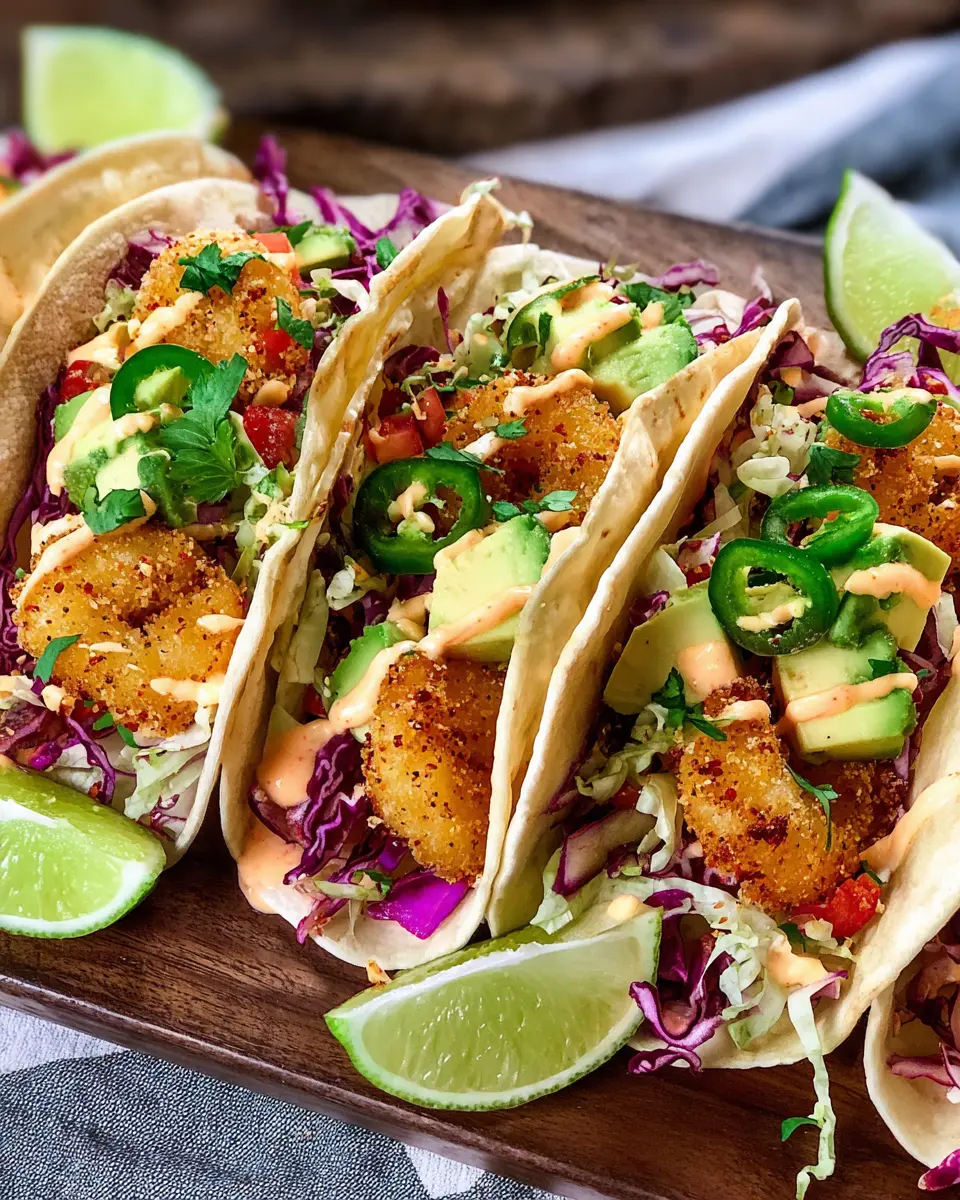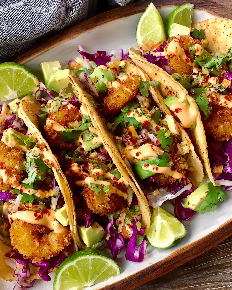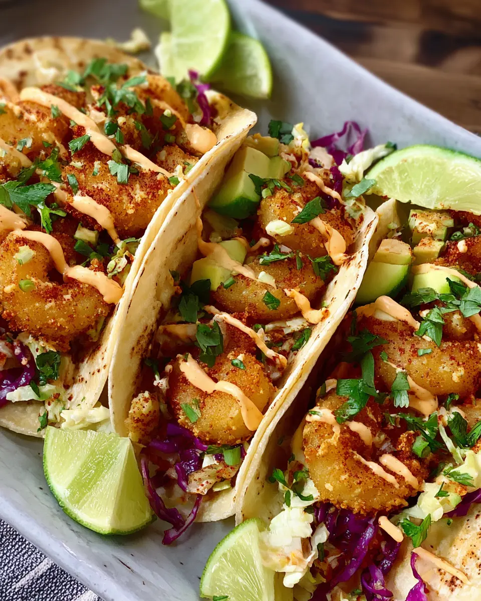 In conclusion, these crispy shrimp tacos are the perfect blend of crunch and flavor, making them an exciting addition to your weeknight dinners or gatherings. With the zesty sriracha-chili aioli and fresh cabbage slaw, they’re sure to impress and satisfy. Enjoy this delightful dish with friends and family!