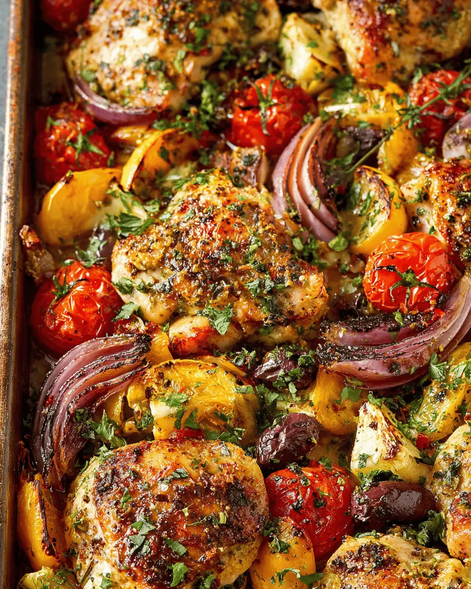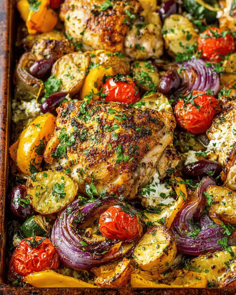 In conclusion, Greek Sheet-Pan Chicken is a delightful, easy-to-prepare dish bursting with Mediterranean flavors. Perfect for busy weeknights, it brings together tender chicken thighs, colorful veggies, and tangy feta in one pan. Try it with crusty bread to scoop up the flavorful sauce—your taste buds will thank you!