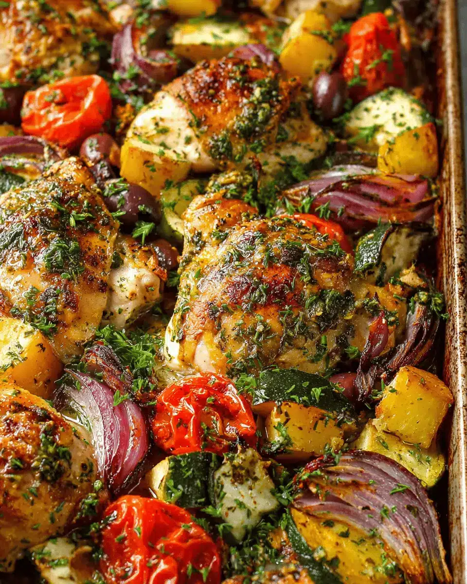 Imagine succulent chicken thighs paired with fresh vegetables like zucchini and bell peppers, all bathed in a tangy, garlicky Greek salad dressing. Not only is this dish packed with Mediterranean goodness, but it also offers flexibility; feel free to swap in seasonal veggies or whatever you have on hand.