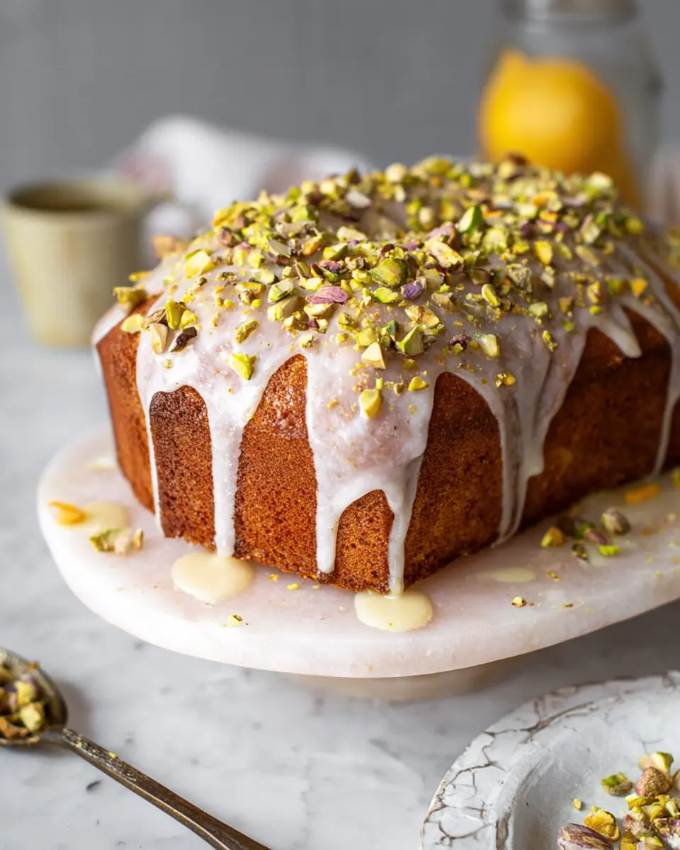 The glaze adds a delightful tangy sweetness that contrasts beautifully with the nutty flavors of the cake. It keeps the surface moist and gives your Homemade Lemon Pistachio Cake a lovely glossy finish. Plus, you can adjust the thickness of the glaze to your preference — a thicker glaze creates a nice crunch, while a thinner glaze seeps into the cake for extra flavor!