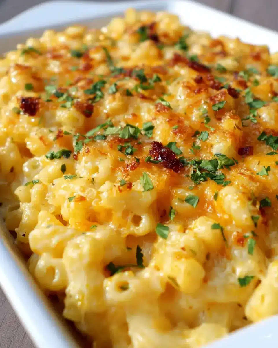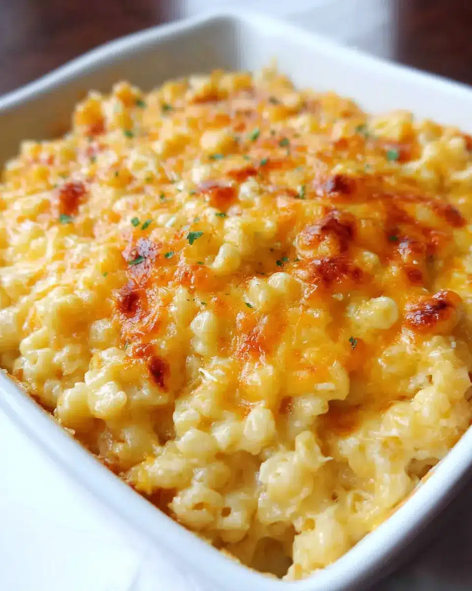 The final step is to give your Mac & Cheese that golden, bubbly finish. Sprinkle the reserved cheese blend on top and bake in the preheated oven for 15 to 25 minutes. Keep an eye on it — you want that perfect crust, but not burnt! Once it’s golden and enticingly bubbly, take it out and let it cool slightly before serving.