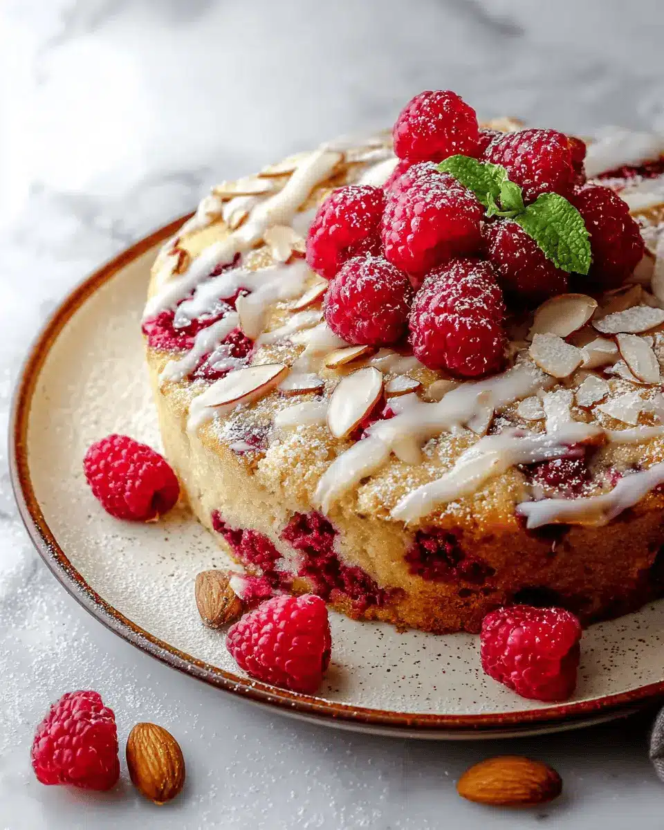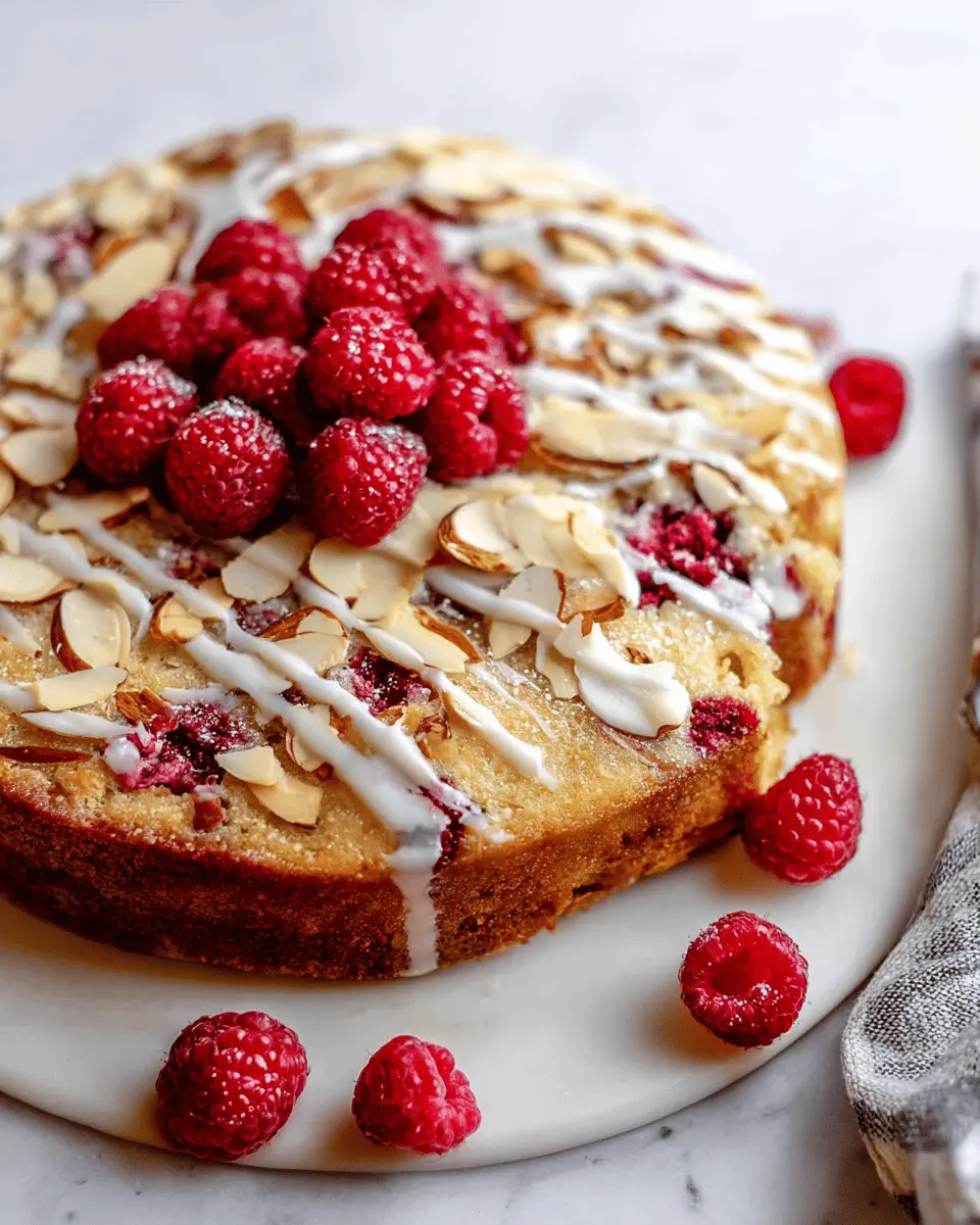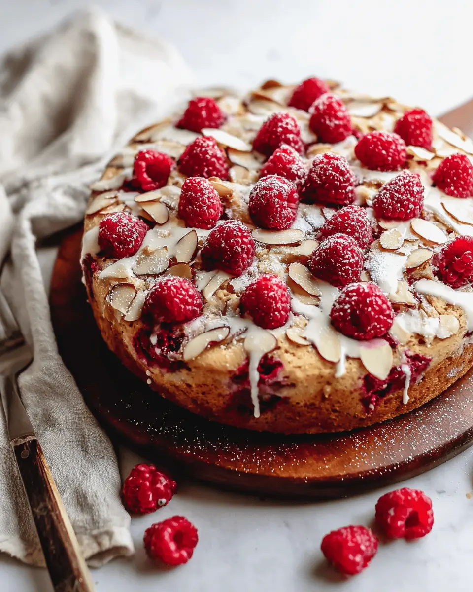 Presentation is key when it comes to dessert! Dust the raspberry almond cake with powdered sugar just before serving for an elegant touch. Arrange fresh raspberries and sliced almonds on top for a beautiful finish. If you're feeling creative, use a fine mesh sieve to create a delicate icing sugar pattern. A decorative cake stand or simple white platter enhances its visual appeal. Don’t forget to add a sprig of mint for color—a little detail that makes a huge difference!