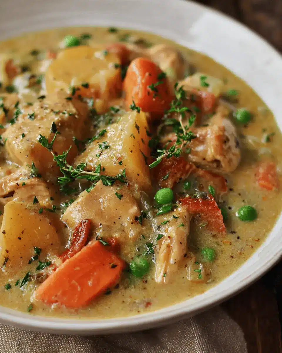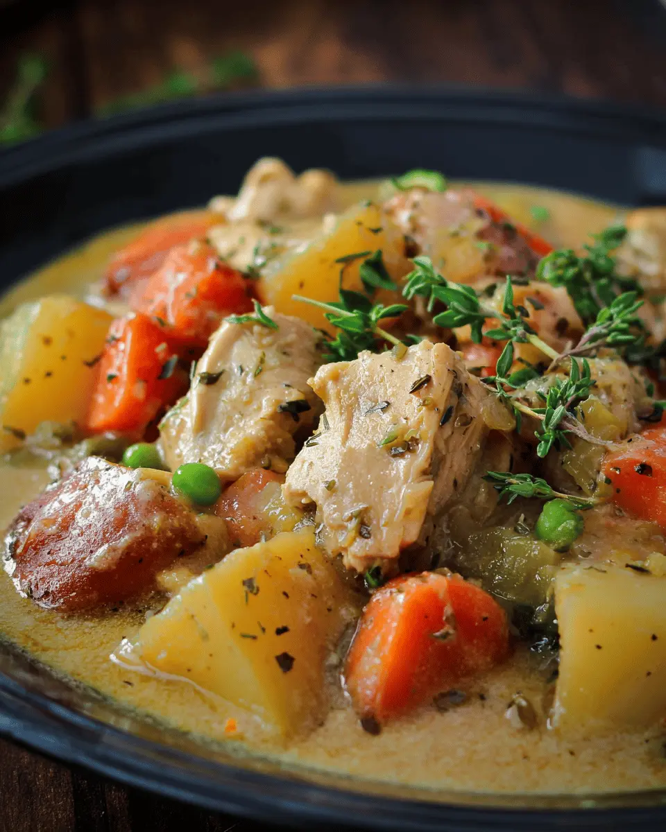 Once the cooking time is up, remove about ½ cup of the liquid from the slow cooker. In a small bowl, whisk together ¼ cup of all-purpose flour and ½ cup of whole milk until smooth. Pour this mixture back into the slow cooker and add 1 cup of frozen peas. Stir well, cover, and let it cook for an additional 15-20 minutes until thickened to your liking. This step ensures your stew has the rich, comforting texture that makes each bite satisfying.