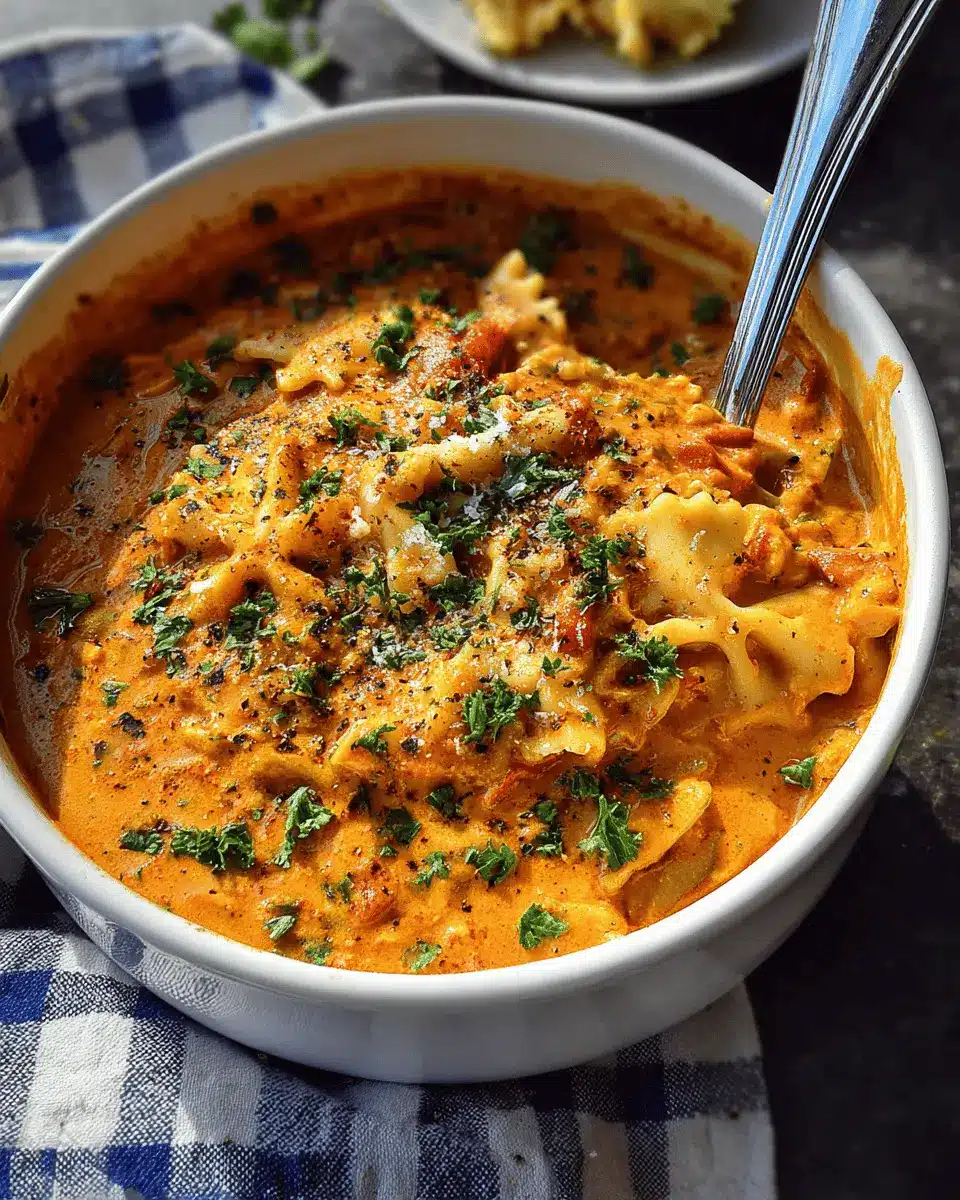 Presentation is key! Top your Vegan Lasagna Soup with a sprinkle of fresh parsley or basil to add a pop of color. If you want an extra creamy touch, add a dollop of vegan ricotta or mozzarella. Don’t forget a drizzle of olive oil or a sprinkle of red pepper flakes for a bit of heat. A beautiful presentation not only delights the eyes but will impress your family and friends!