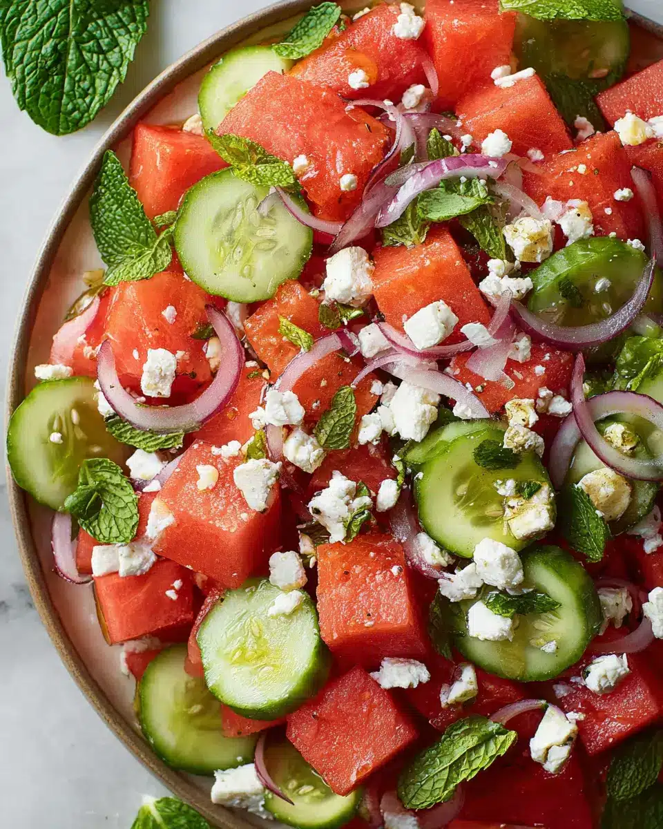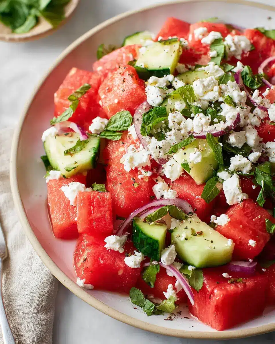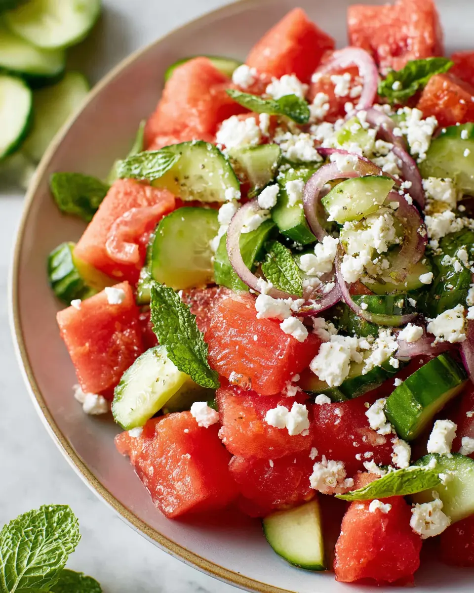 This watermelon salad with feta is a delightful way to celebrate summer flavors! With its vibrant colors and refreshing taste, it’s perfect for any gathering or just as a light meal. Give it a try; it might just become your new favorite summer dish!